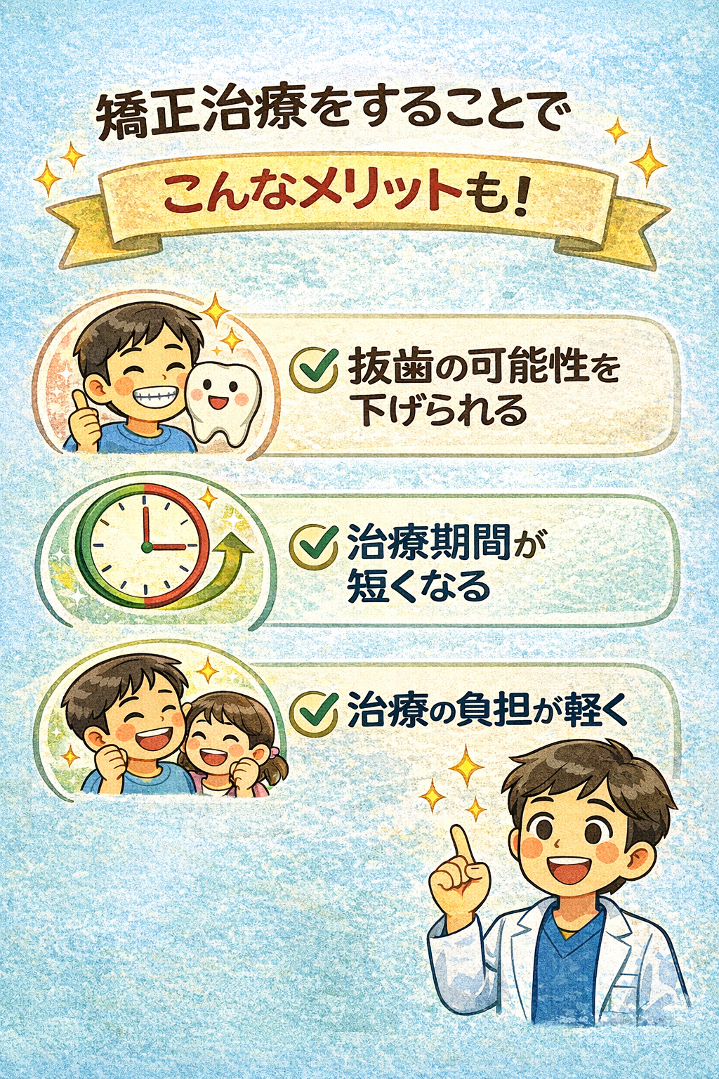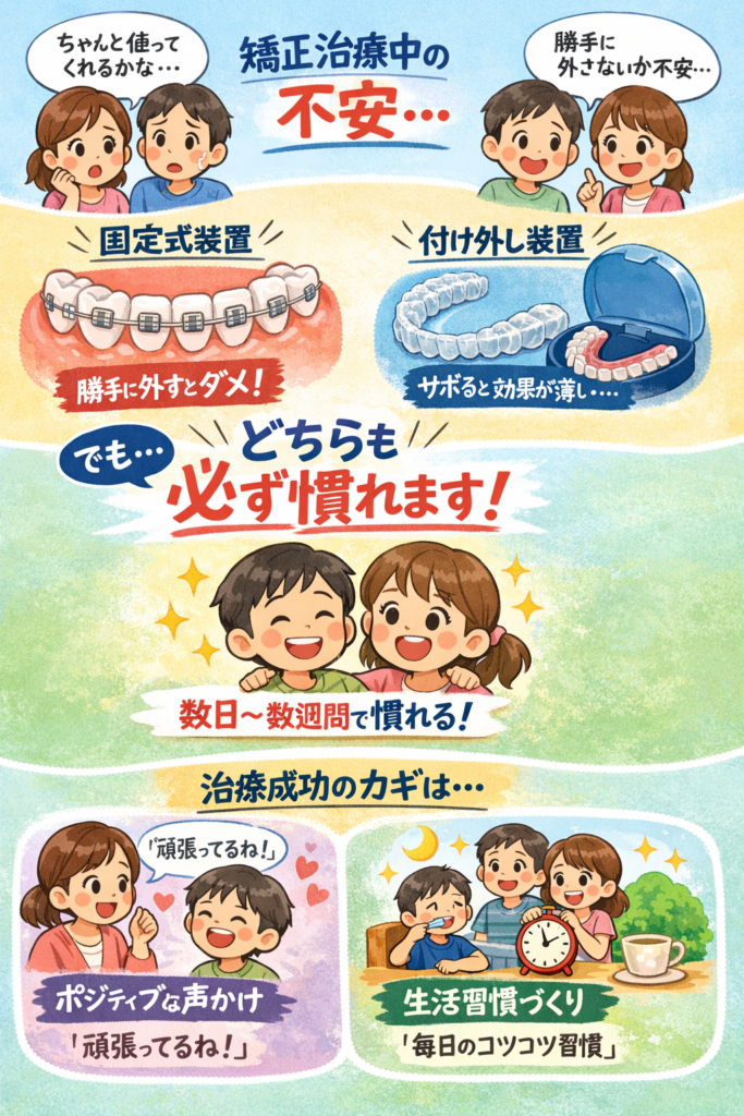 矯正治療中にお子様のモチベーションを下げないためにも、保護者の声かけや生活習慣への組み込みが治療成功の大きなポイントになります。