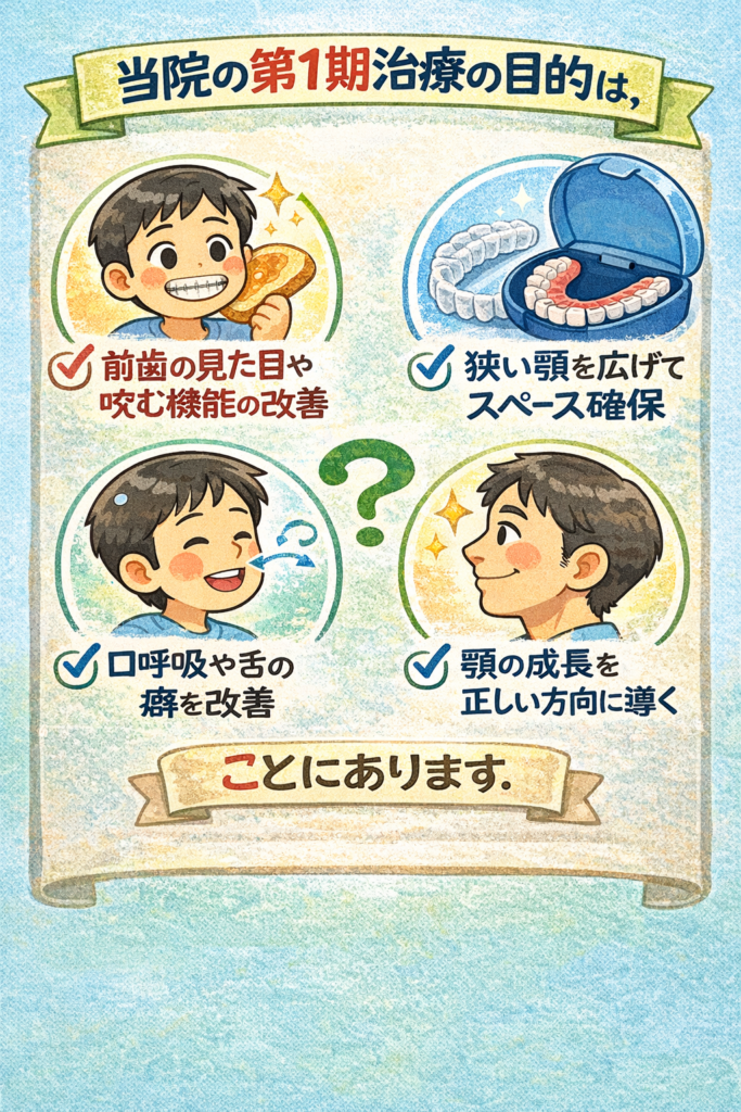 第1期治療は、歯並びを完成させる治療ではありません。将来の本格矯正(第2期治療)を効率よく進めるための土台作りの時期です。