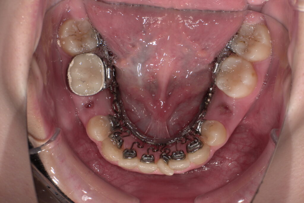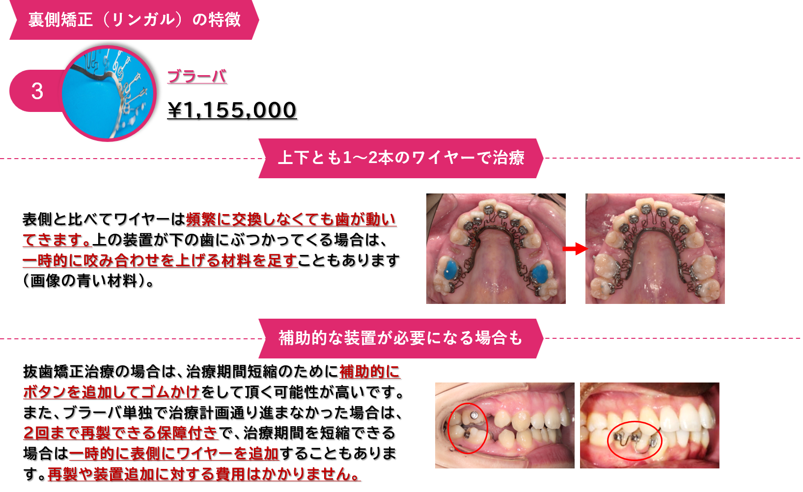 すべての装置が歯の裏側(舌側)に装着されるため、見た目ではほとんど矯正していることがわかりません。従来の舌側矯正では、歯の裏側にブラケットとワイヤーを固定して歯を並べていましたが、Bravaでは各歯に個別の「アクティブブラケット」を装着し、それぞれが独立して歯を動かす構造になっています。