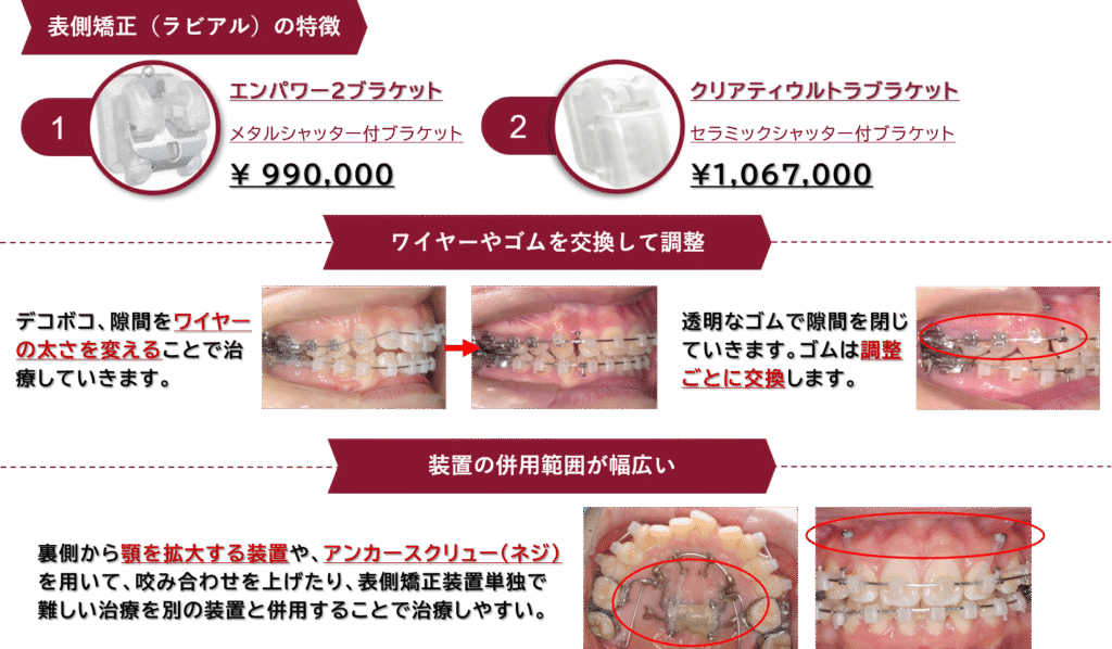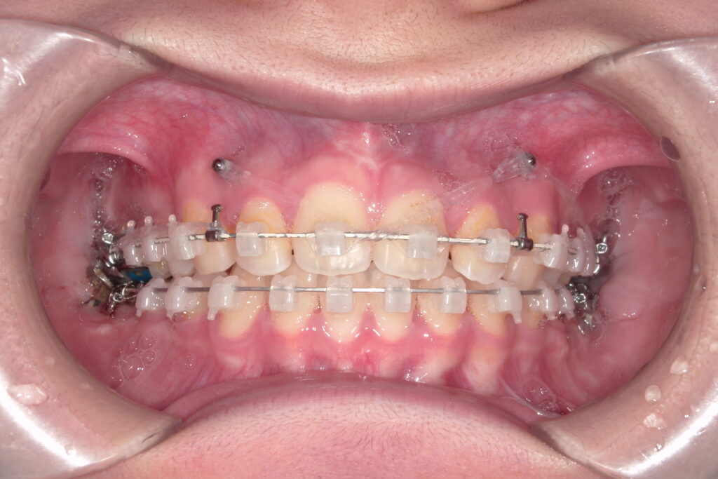 表側矯正は、歯の表面にブラケットと呼ばれる小さな装置を装着し、それにワイヤーを通して歯を少しずつ動かしていく治療方法です。もっとも古くから使われているスタンダードな方法で、幅広い症例に対応できるのが大きな魅力です。最近では、アンカースクリュー(ネジ)を併用することで、従来の治療よりも出っ歯や過蓋咬合(深い咬み合わせ)の治療が効率的に進められるようになりました。当院では、歯の色になじみやすいオールセラミックブラケットや、白くコーティングされたホワイトワイヤーも選択可能で、目立ちにくさにも配慮しています。