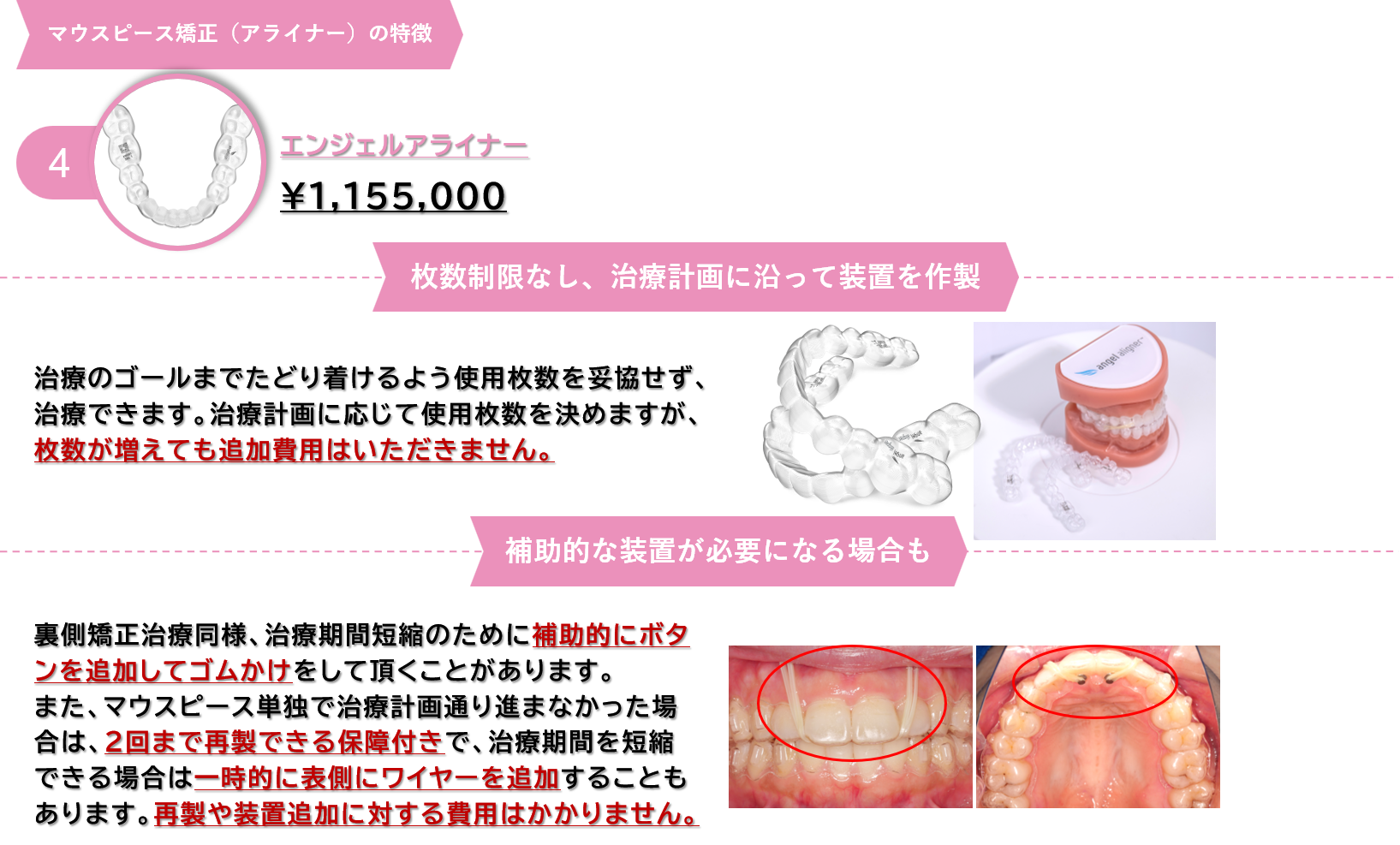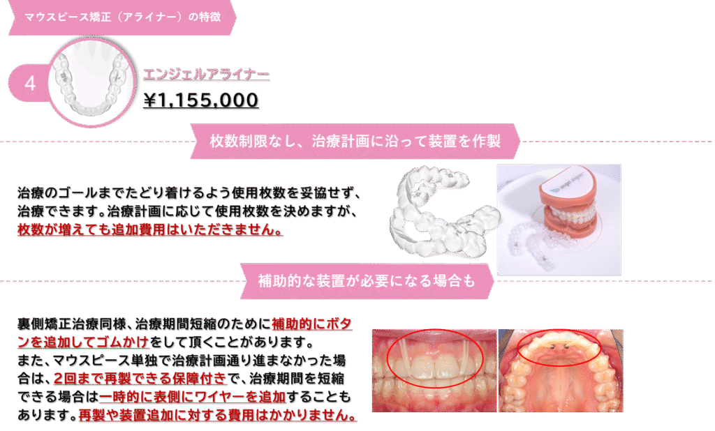歯の表面にアタッチメントという突起を装着し、透明なマウスピースを一定期間ごとに交換しながら、少しずつ歯を動かしていく治療法です。当院では、エンジェルアライナーを採用しています。
