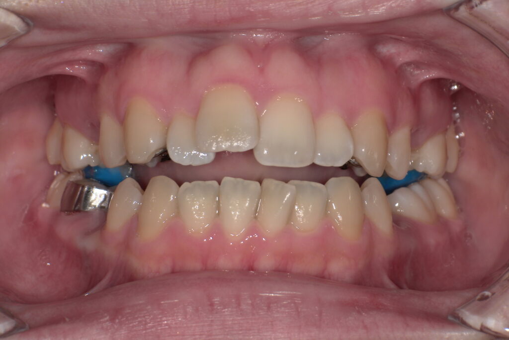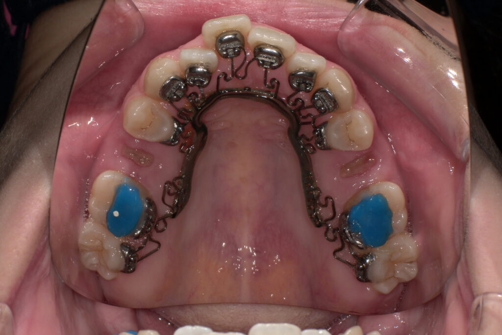 (青い材料は下の歯が上の装置にぶつからないよう、咬み合わせを一時的に上げる材料です)