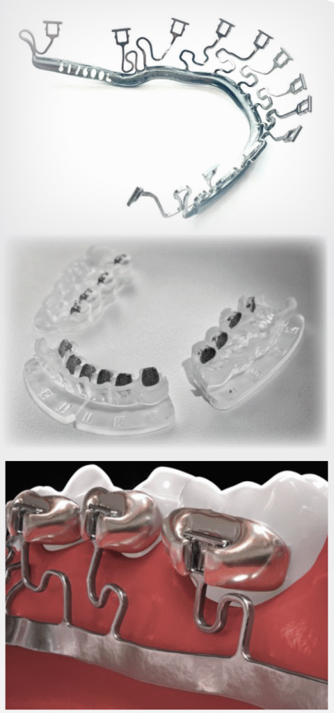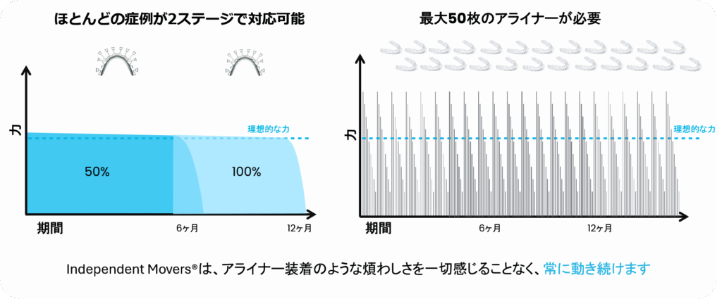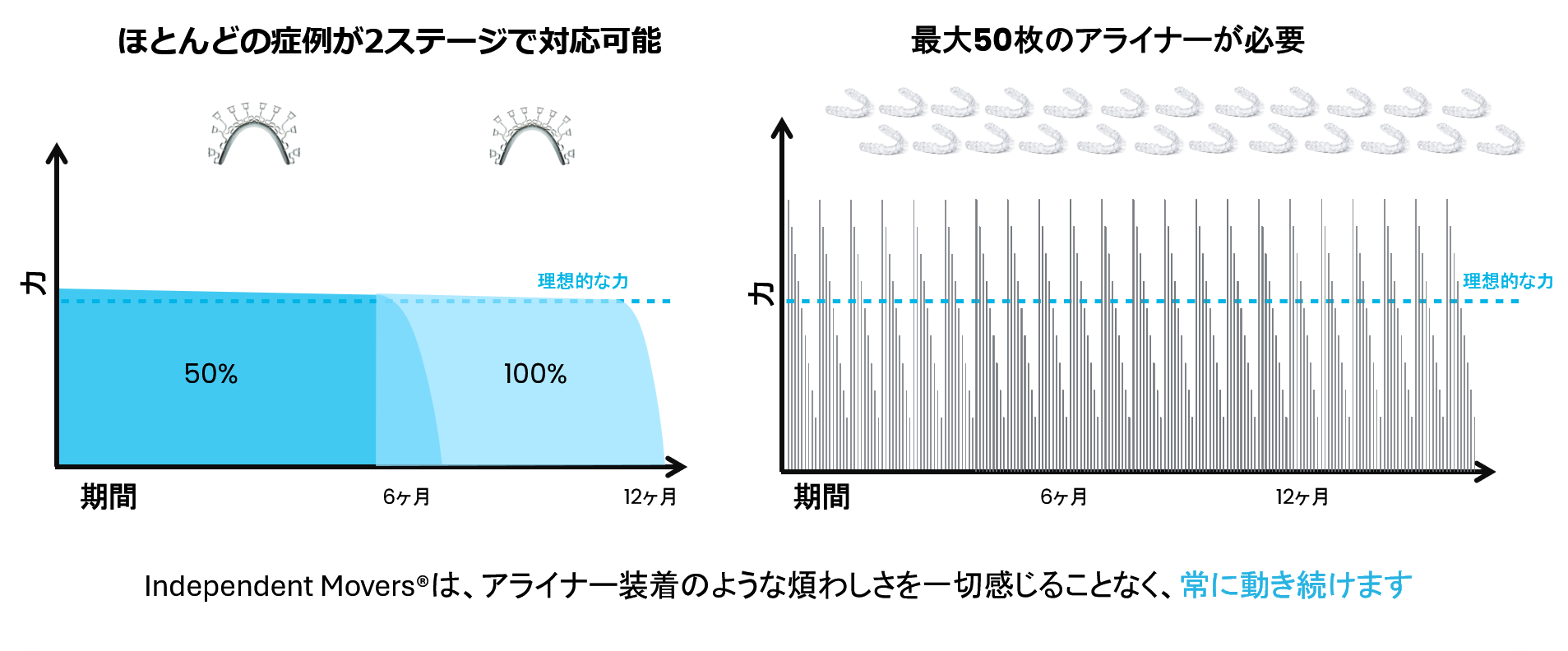 『インディペンデント・ムーバー・テクノロジー』という技術で1本1本の歯に移動様式を加え、同時に歯を動かしていきます。全顎的な固定源(アンカレッジユニット)を必要とせず、各歯が「自己アンカレッジ」的に動く仕組みです。また、必要に応じて一部の歯を「スタビライザー」として一時的に固定源に設定することも可能です。