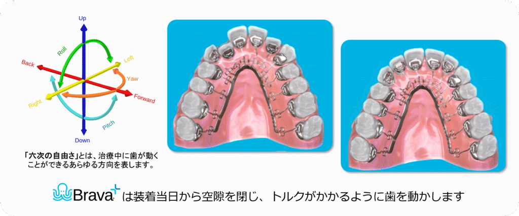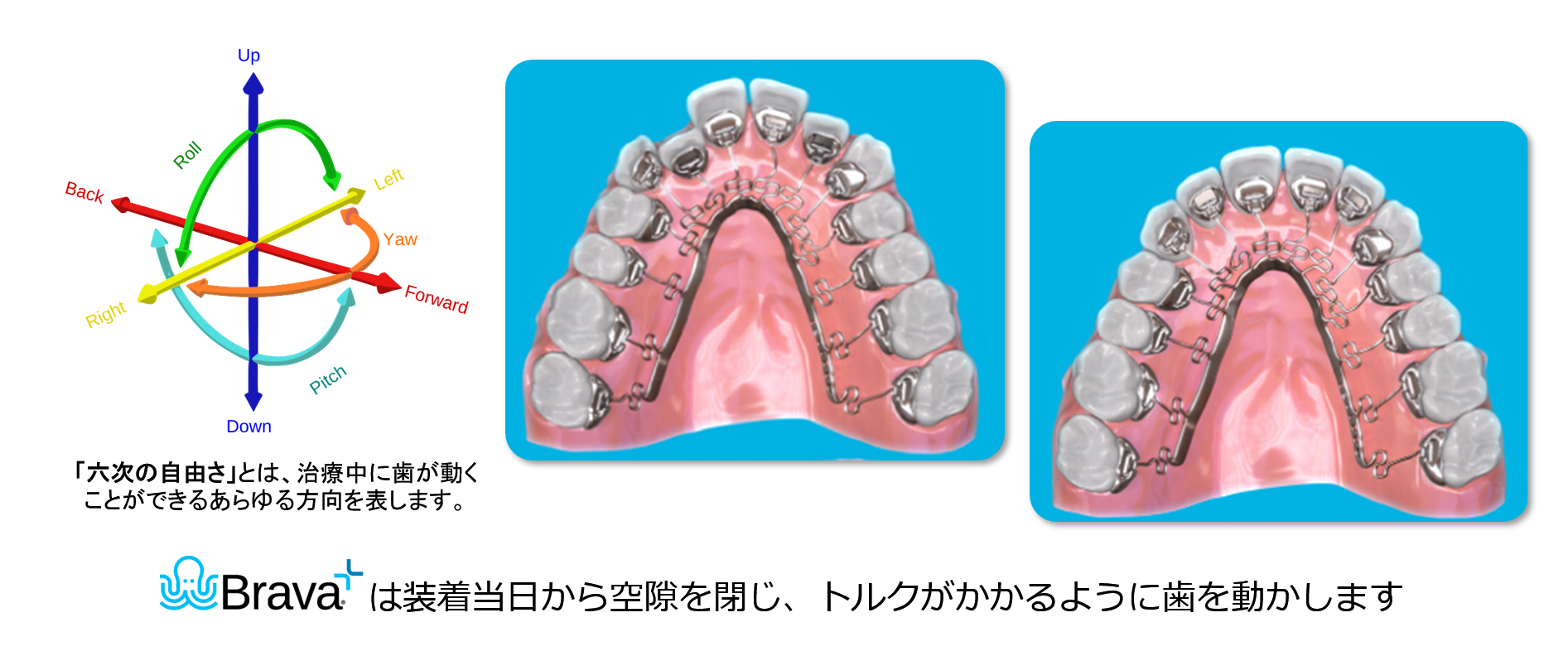 ブラーバは上記の3ステップを1ステップにしてワイヤーに組み込んで歯の移動を行うため、従来の装置より比較的短期間での治療が可能です。