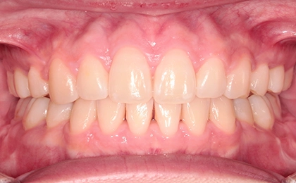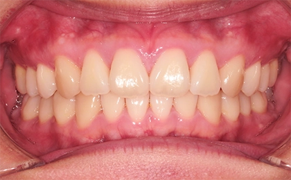 治療内容 | 表側矯正装置を使用し、非抜歯矯正で治療しました。ガミースマイルはワイヤーで改善できる範囲内で前歯を歯根方向に圧下し、治療しました。 |
