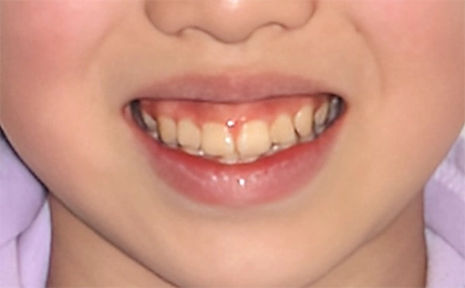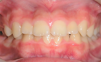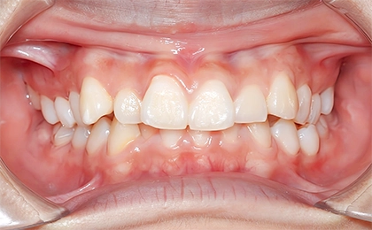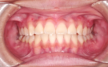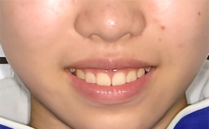 治療内容 | 上下のあご、特に上が狭くV字型歯列であったため、MSEによる骨格性の拡大装置を使用し、表側矯正装置で歯の隙間や出っ歯の治療を行いました。 |