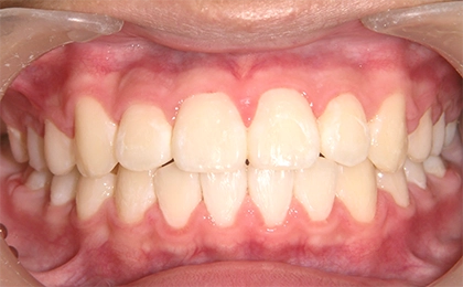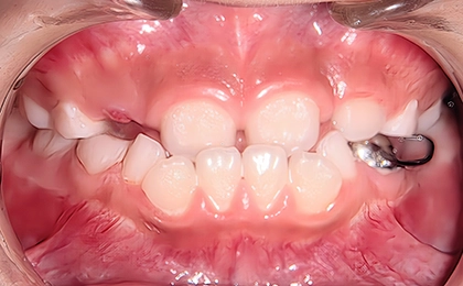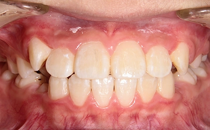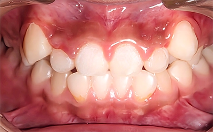 治療内容 | 上のあごに固定式の拡大装置を装着し、あごを拡げてできた隙間で上の前歯のガタガタを治療し、永久歯列に生え変わるまで経過観察を行いました。 |